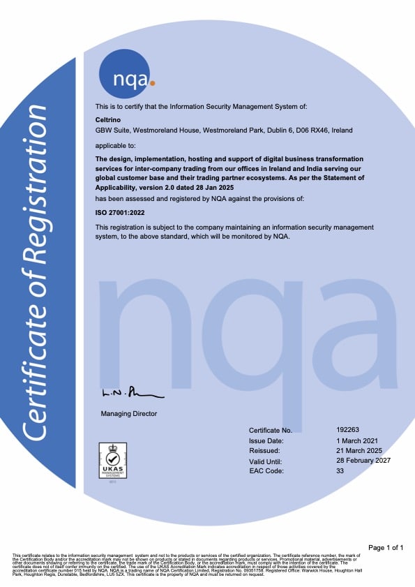 At Celtrino, we make data protection our number one priority. With the EDI ISO certification, we ensure that we can remain ever vigilant to potential threats targeting your data, being able to identify and manage any risks consistently. Find your perfect EDI solution here at Celtrino and become a partner safe in the knowledge that our EDI ISO certification ensures we will keep your business free from cyber-based threats.